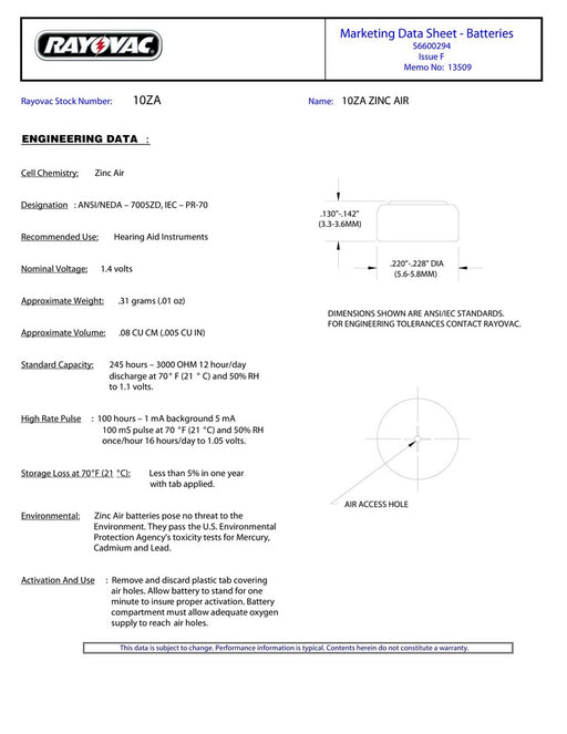 Rayovac Misura 10 - Blister da 6 Batterie per Protesi AcusticheSpecifiche Modello 10 - PR70 - P10 Codice Colore: Giallo Numero di batterie 6 Str...