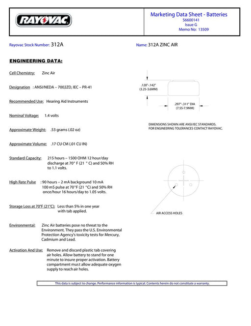 Rayovac Misura 312 - Blister da 6 Batterie per Protesi Acustiche Specifiche Modello 312 - PR41 - 312A Codice Colore: Marrone Numero di batterie 6 ...