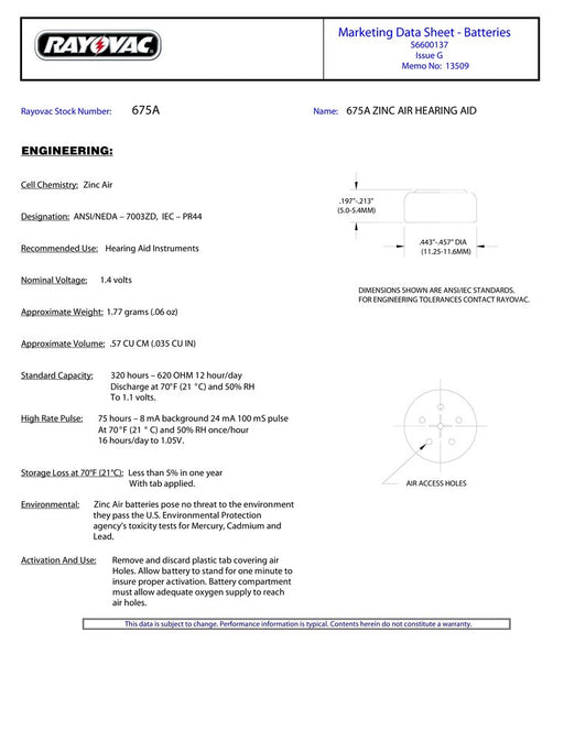 Rayovac Misura 675 - Blister da 6 Batterie per Protesi Acustiche Specifiche Modello 675 / PR44 / P675 Codice Colore: Blu Numero di batterie 6 Stru...